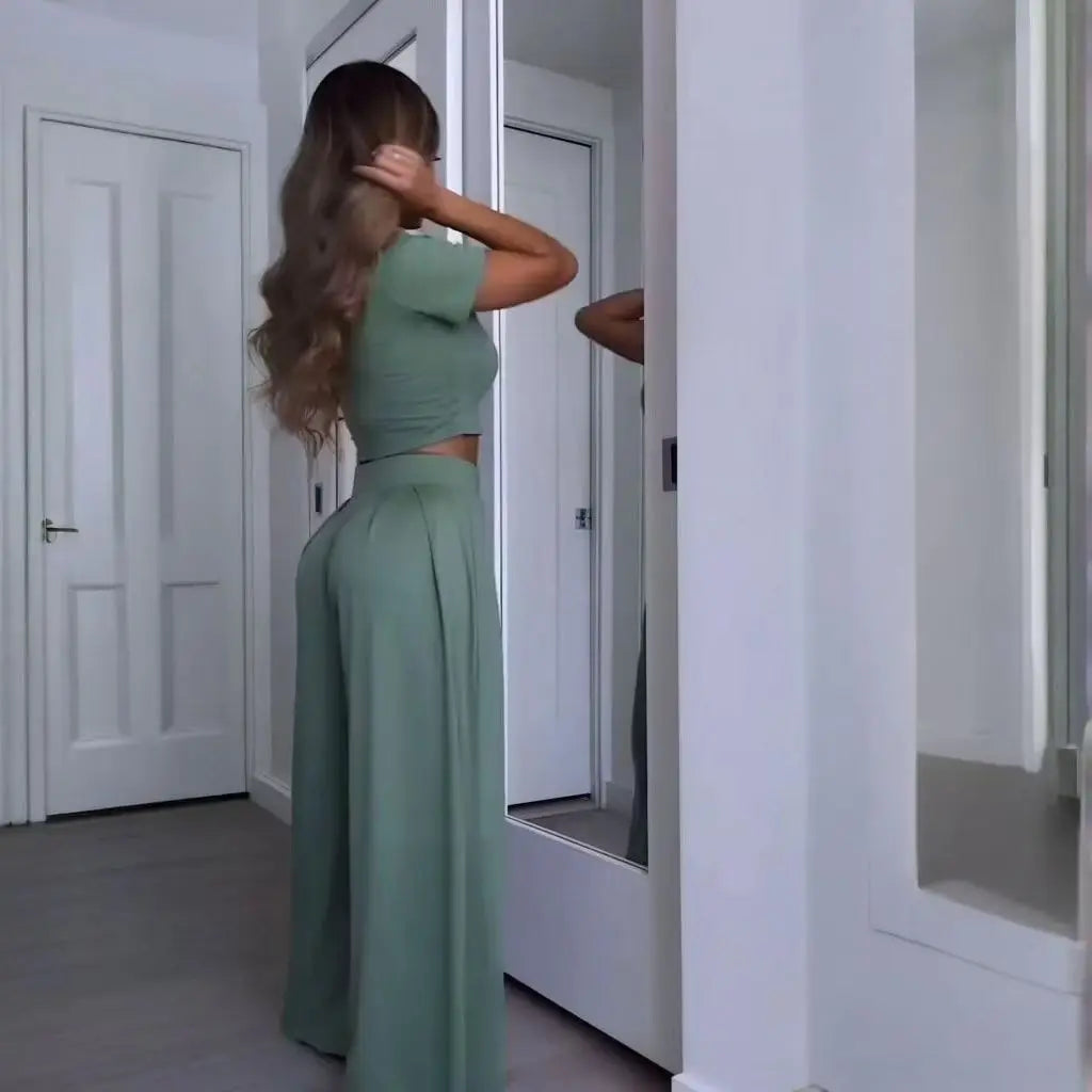 2025 Summer European and American Crew Neck Solid Color Sexy Wide-leg Pants Fashion Casual Set for Women