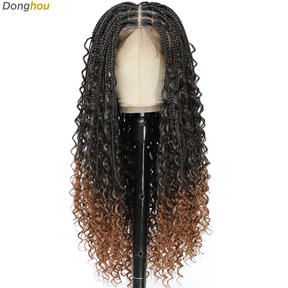 Boho Goddess Box Braid Wig with Baby Hair Lace Front Braided Wigs for Women Brown Hair Synthetic Blended Braids Wig Curly Hair