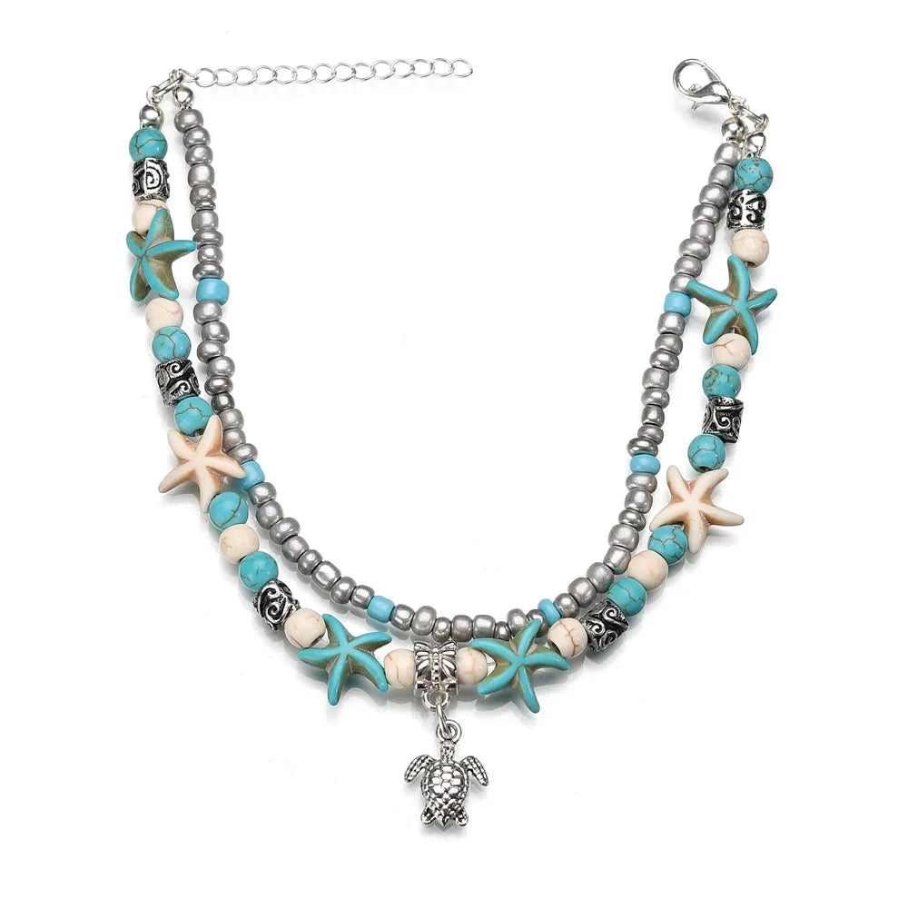 Boho Summer Beach Anklets For Women Turtle Shell Starfish Tree of Life Elephant Ankle Bracelet Multilayer Chain On Foot Jewelry