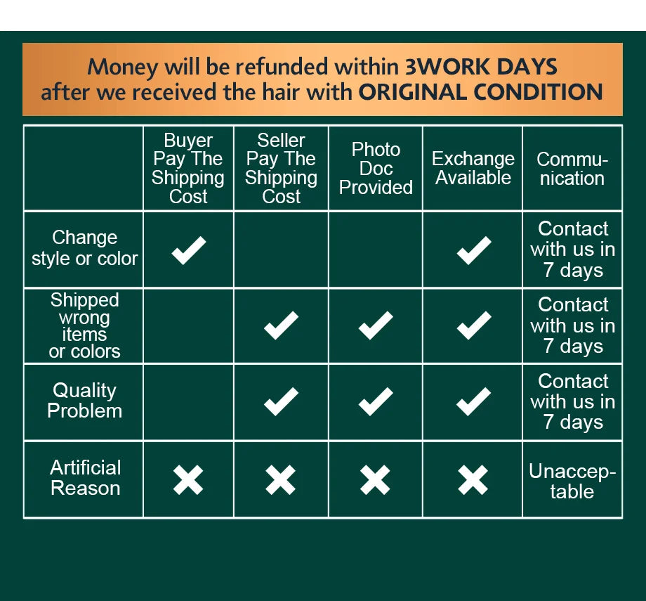(No refund/exchange for hair being installed, cut, dyed, washed or and damage & processed)