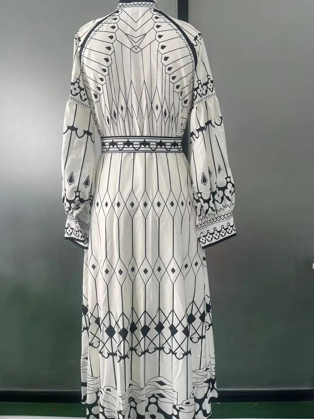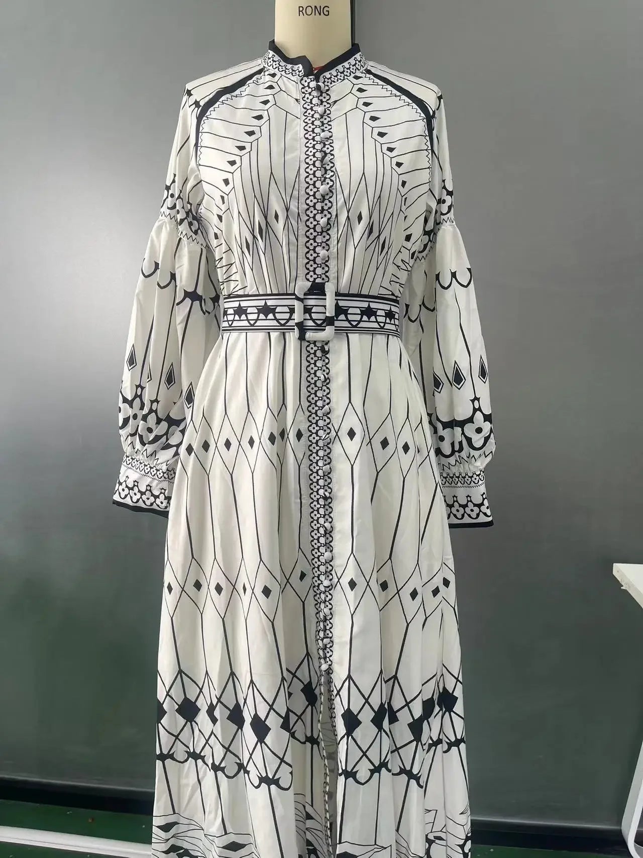 Retro Elegant Stand Collar Long Dress Women Spring Pattern Print Belted Buckle Party Dress Autumn Long Sleeve A-Line Boho Dress